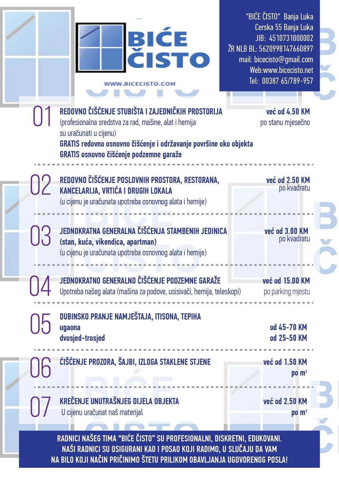 Cjenovnik usluga čišćenja u Banjoj Luci obuhvata standardne pakete za stambene i poslovne prostore. Ukoliko su vam potrebne prilagođene usluge čišćenja ili imate posebne zahtjeve, kontaktirajte nas kako bismo pripremili individualnu ponudu u skladu s vašim potrebama.